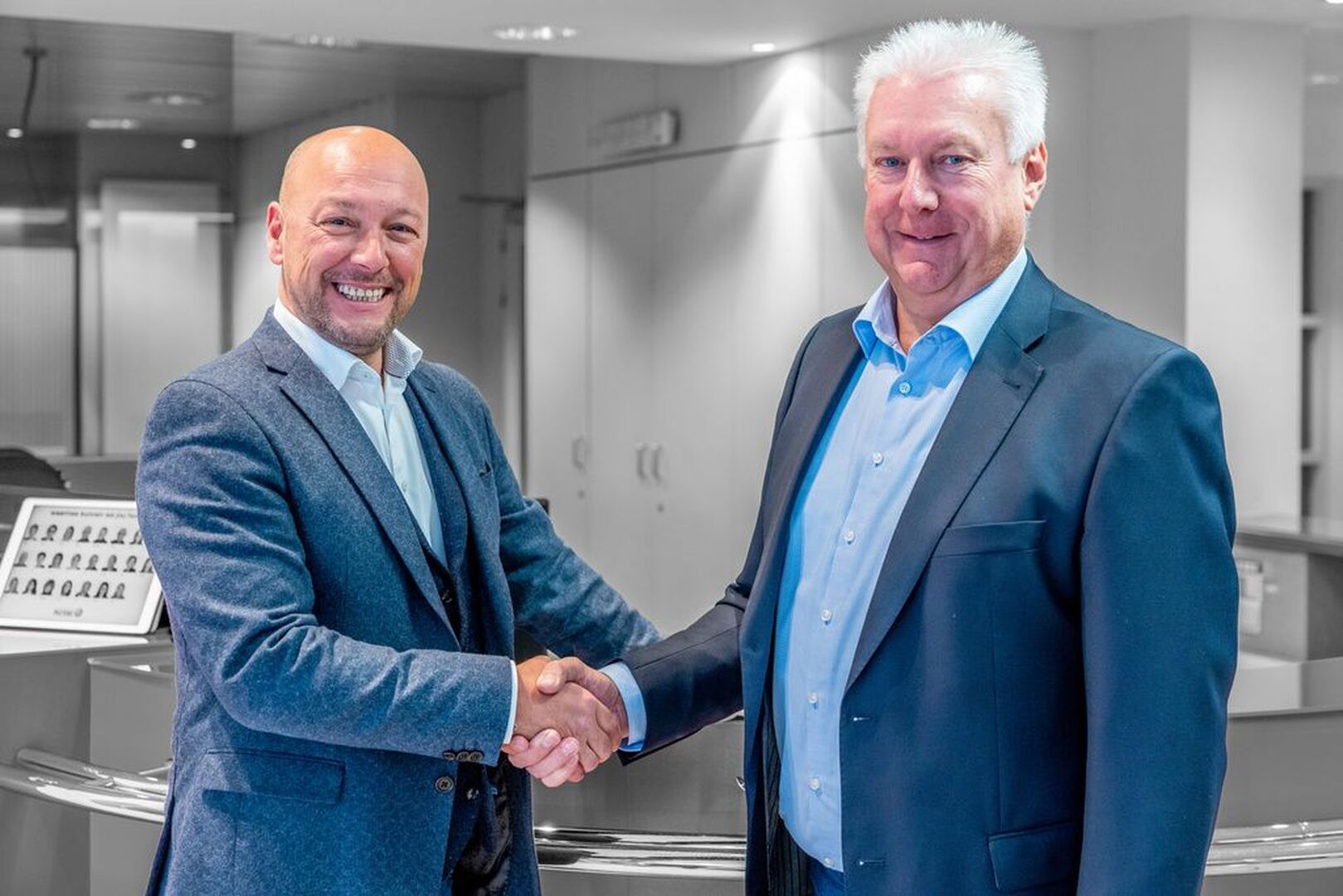 Het duo Wim Verboven en Vic Peeters schudt elkaar de hand in het nieuwe samengesteld kantoor. Immo VL (dat destijds nog VL Trading heette) en Vic Peeters